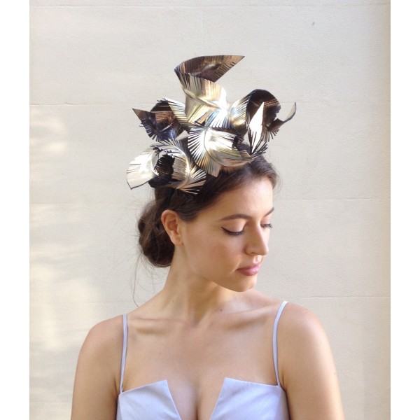an elegant headpiece of twisting metallic leather feathers