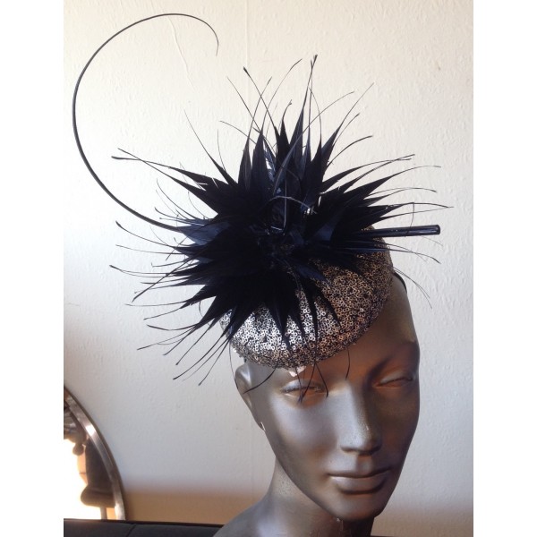 This button hat covered with tiny bronze sequins is topped with a cluster of sharply cut black feathers. An elegant and timeless piece...