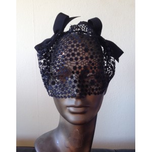 This pretty veil of black guipure lace is caught on a tulle bound headband and finished with two narrow grosgrain ribbon bows.