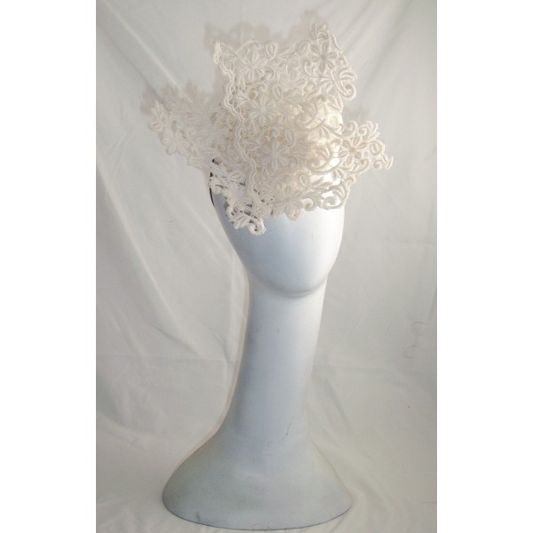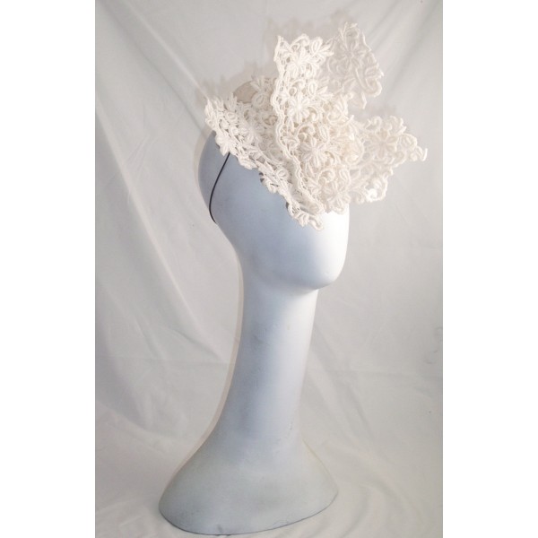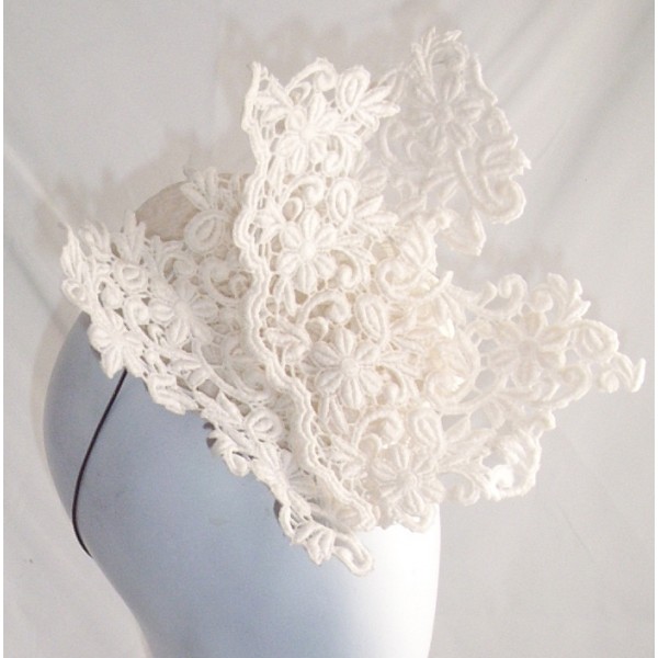 This headpiece is made from drifts of guipure style lace, mounted on a matching lace and sinamay button base.