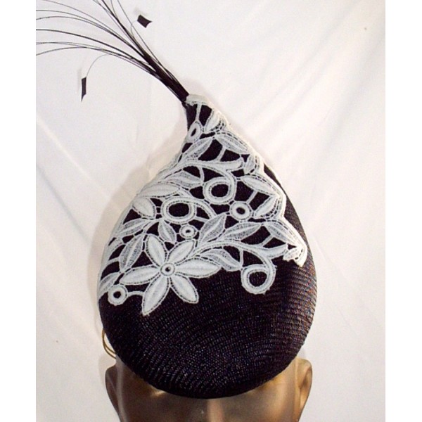 elegant fine black straw teardrop with white guipure lace overlay and sprout of stripped black coque feathers