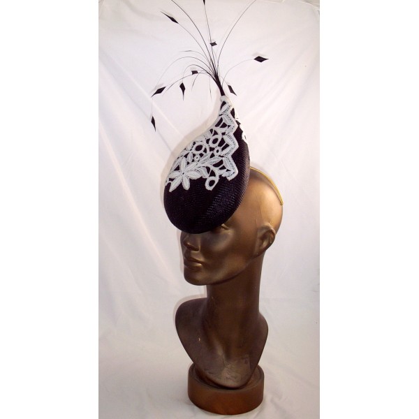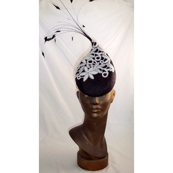 This elegant and curvaceous teardrop shaped piece is fashioned from fine black parisisal straw, with an overlay of white guipure lace. Finished with a spray of long black stripped and manicured coque feathers.