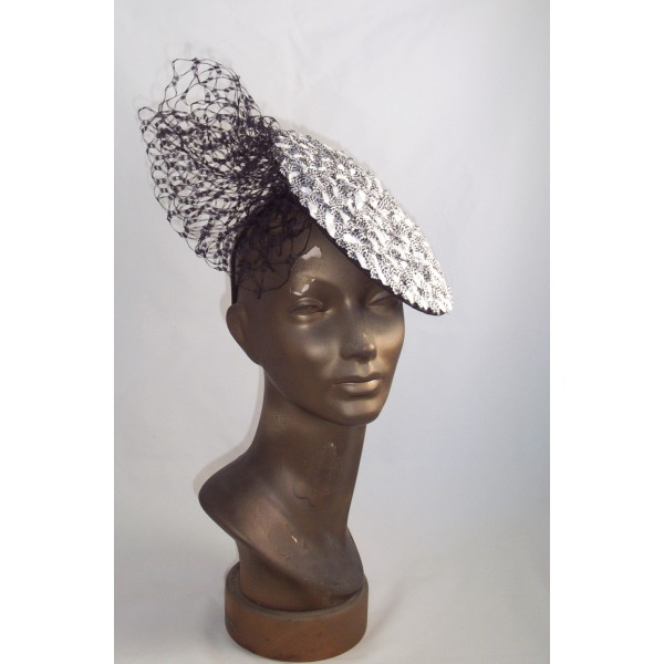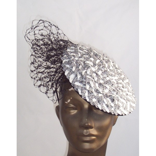 petite tilted disc in swiss racello braid with a puff of veiling