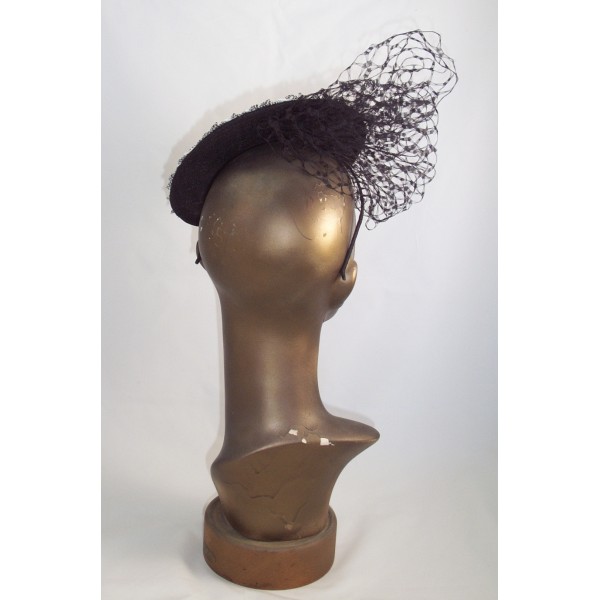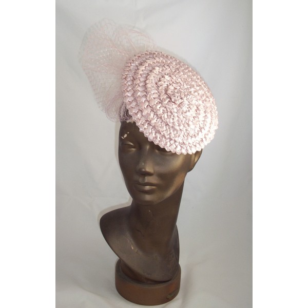 This headpiece is made from vintage look hand worked Swiss racello straw braid over a sinamay base, finished with a puff of delicate veiling, and mounted on a narrow tulle wrapped alice band.