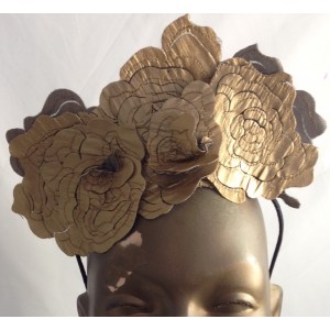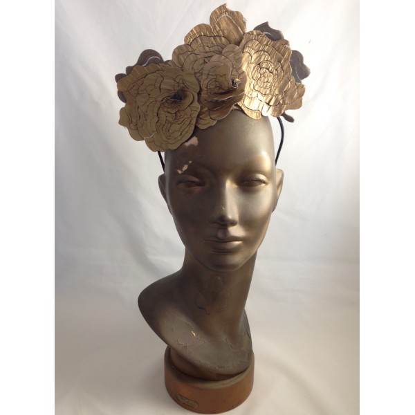 a simple crown of patterned and layered gold faux leather pieces on a tulle wrapped headband