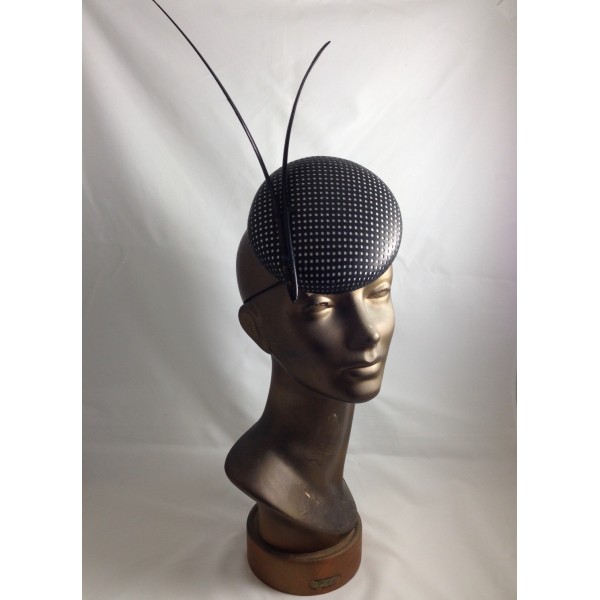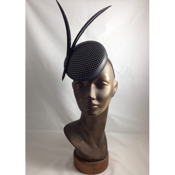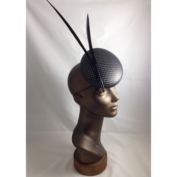 a chic button in black perforated leather over white fur felt with two shaved black feathers